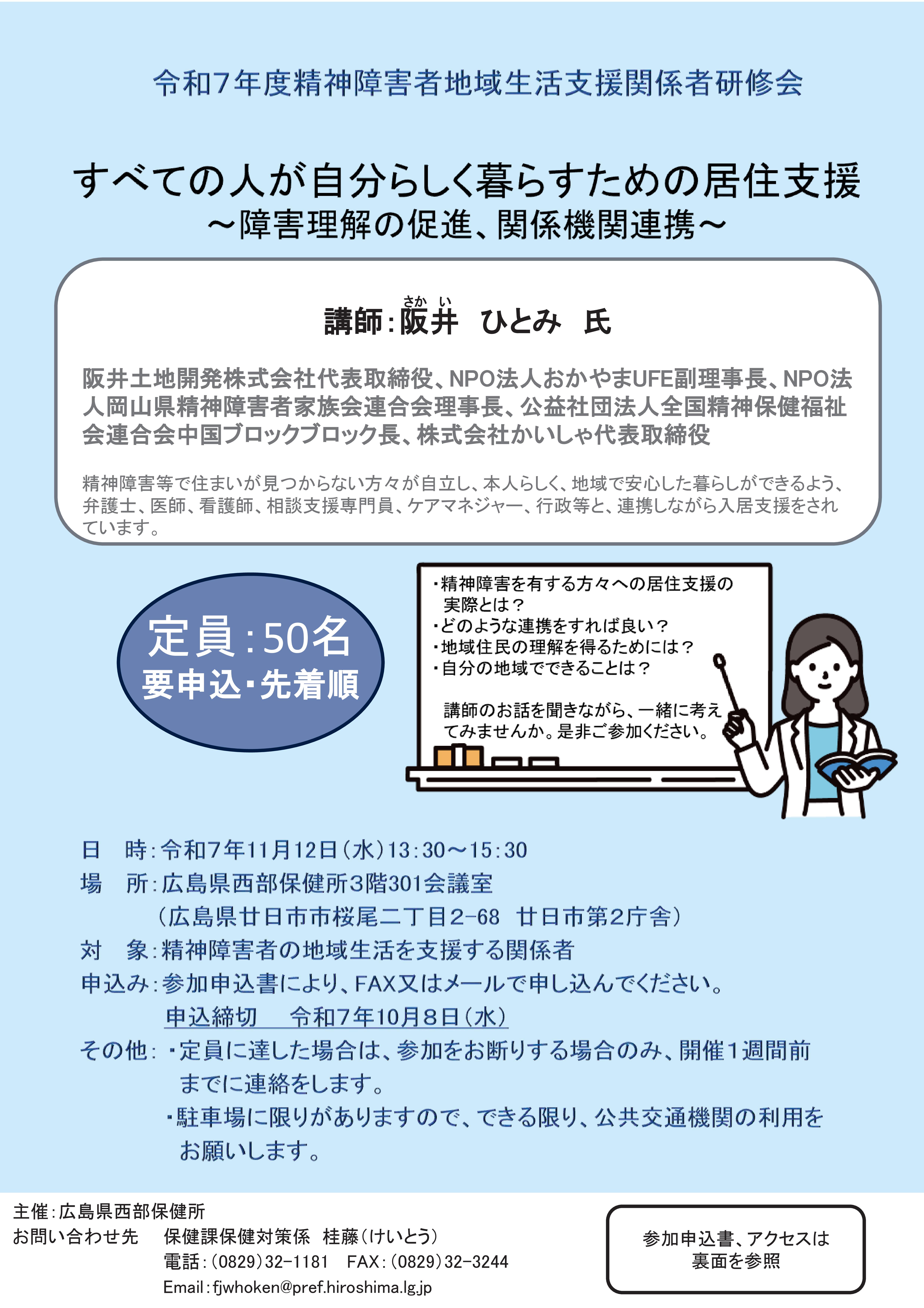 広島県西部保健所より「令和7年度精神障害者地域生活支援関係者研修会」開催のご案内について情報提供がありました。 詳細については、チラシをご確認ください。