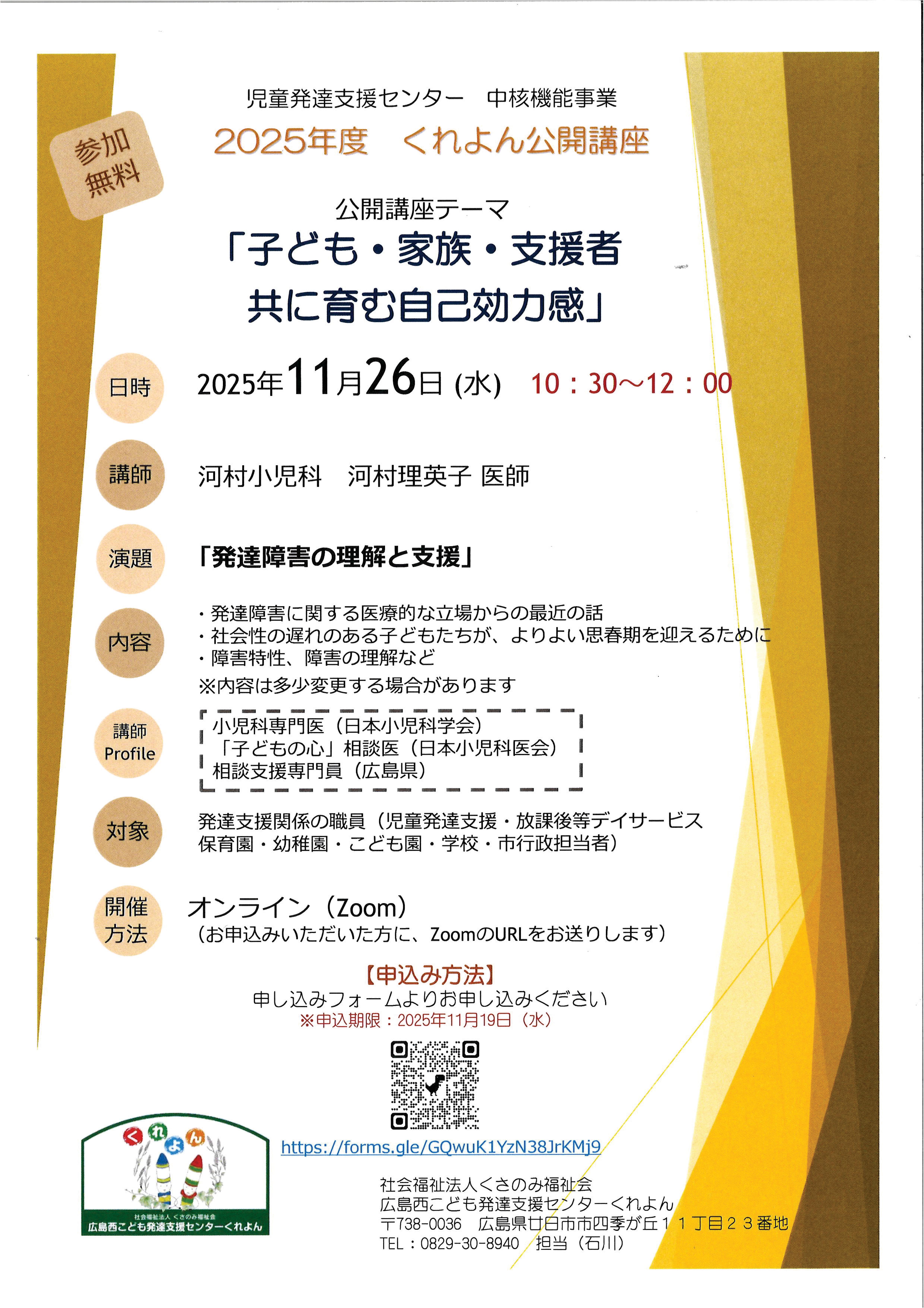 広島西こども発達支援センターくれよんより、「児童発達支援センター 中核機能事業 2025年度 くれよん公開講座」開催のご案内について、情報提供がありました。 詳細については、チラシをご確認ください。 チラシをダウンロ …