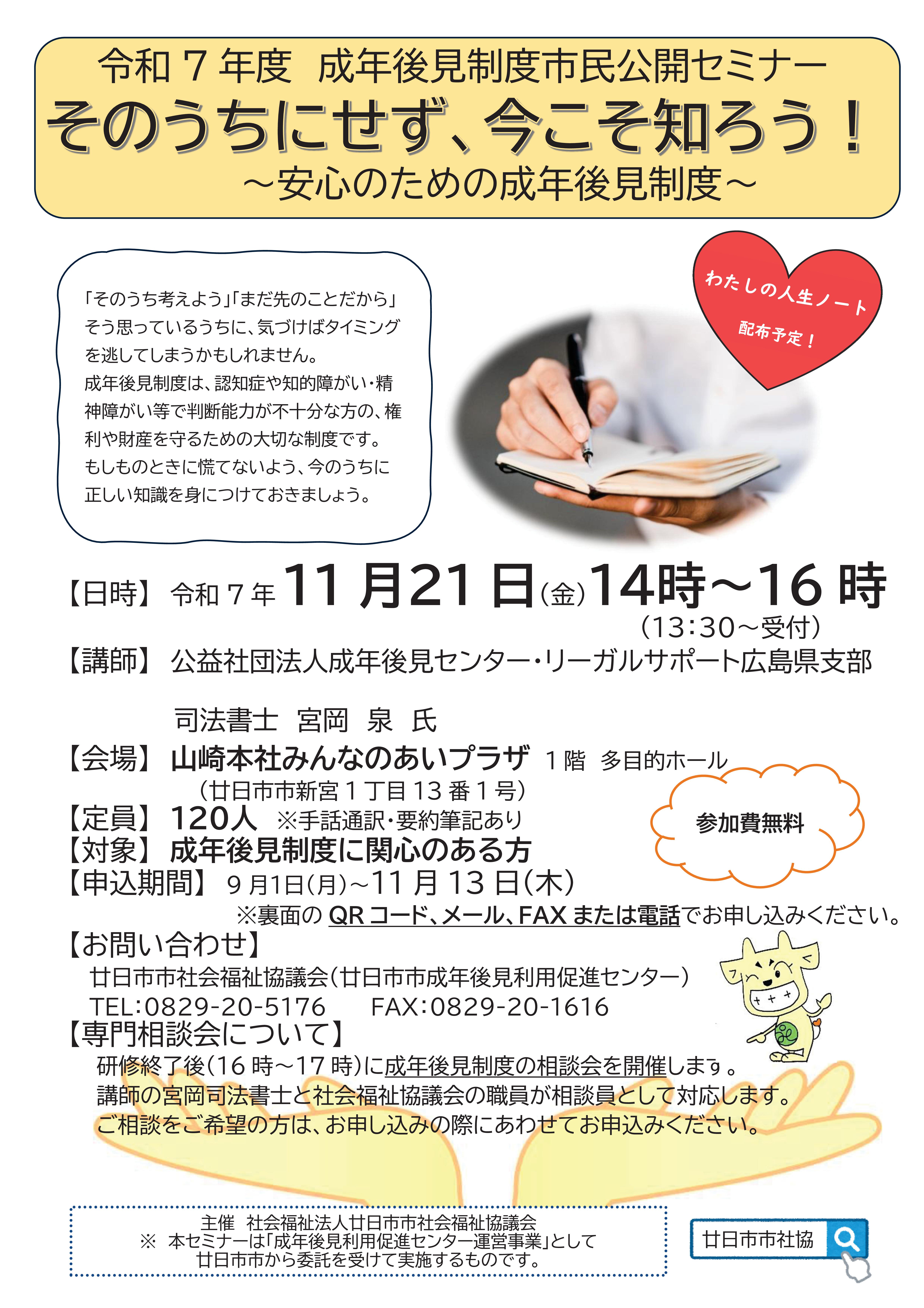 廿日市社会福祉協議会より、11月21日(金)の「令和7年度 成年後見制度市民公開セミナー」開催のご案内について情報提供がありました。 詳細については、チラシをご確認ください。 チラシをダウンロードする場合はこちらから↓↓
