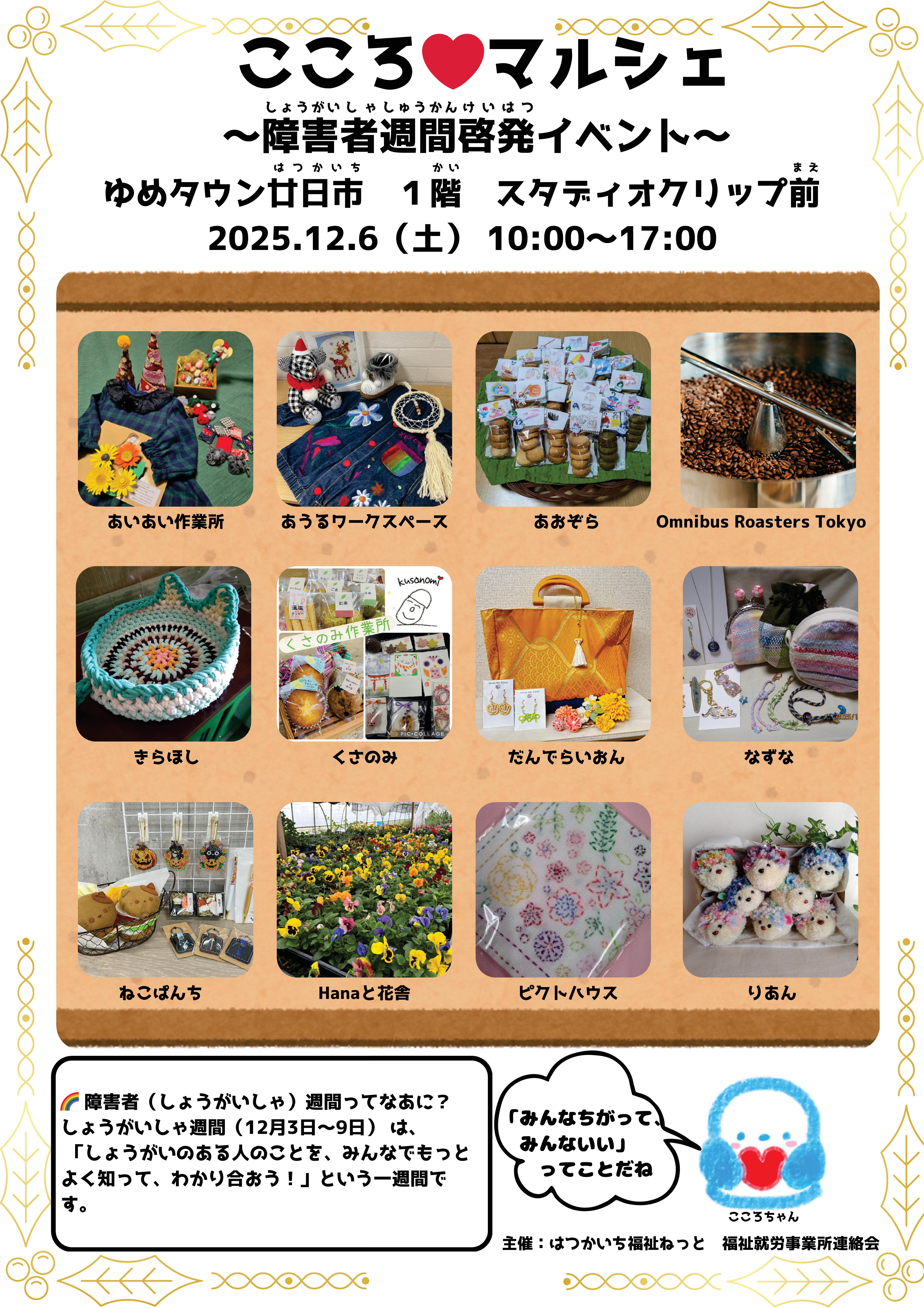 はつかいち福祉ねっと‟障害者週間”では、ゆめタウン廿日市 1階 スタディオクリップ前で、「こころマルシェ~障害者週間啓発イベント~」開催することになりました。 詳細については、チラシをご確認ください。 チラシをダウンロー …