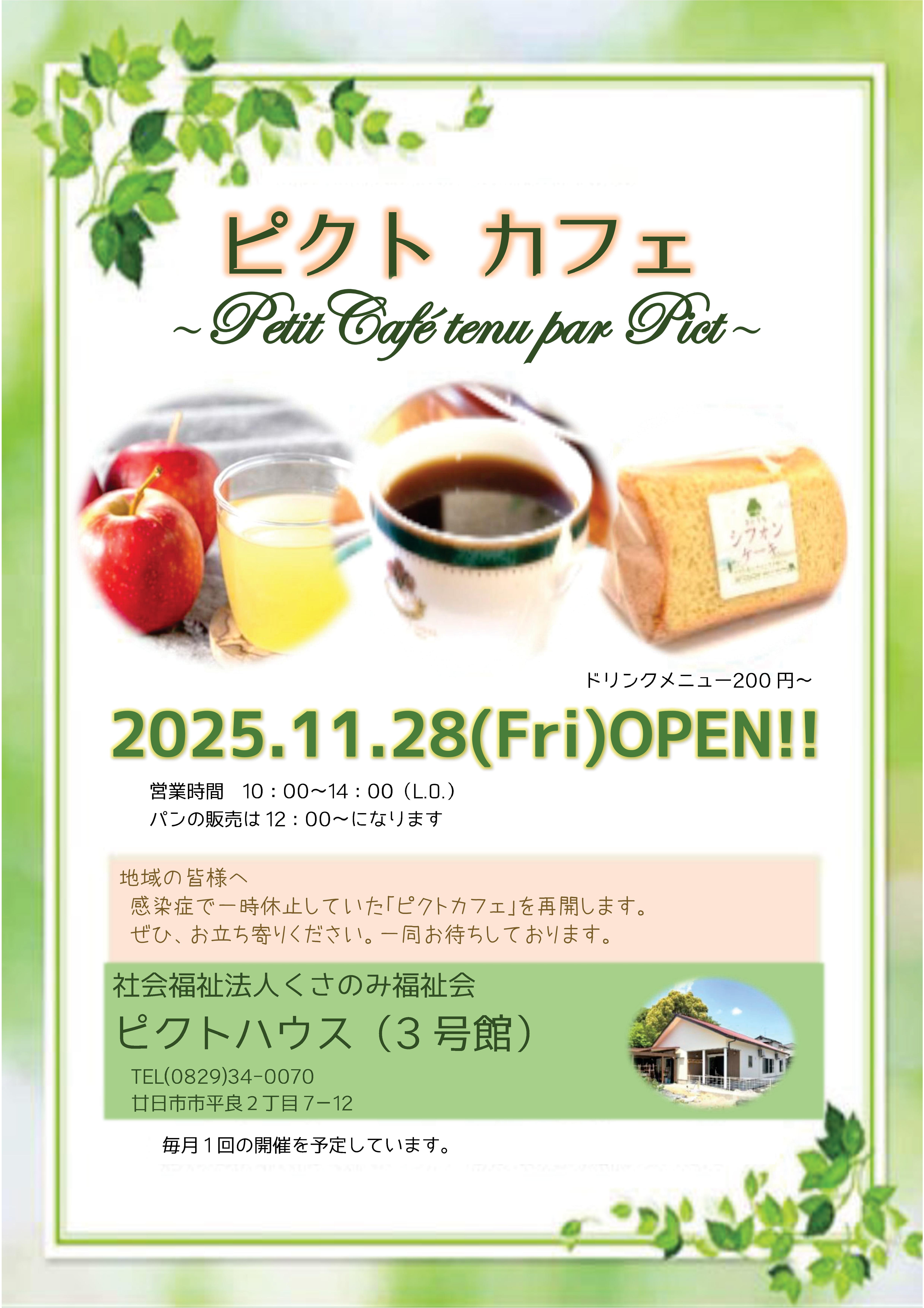 ピクトハウス より、「ピクトカフェ」開催のご案内について、情報提供がありました。 詳細については、チラシをご確認ください。 チラシをダウンロードする場合はこちらから↓↓