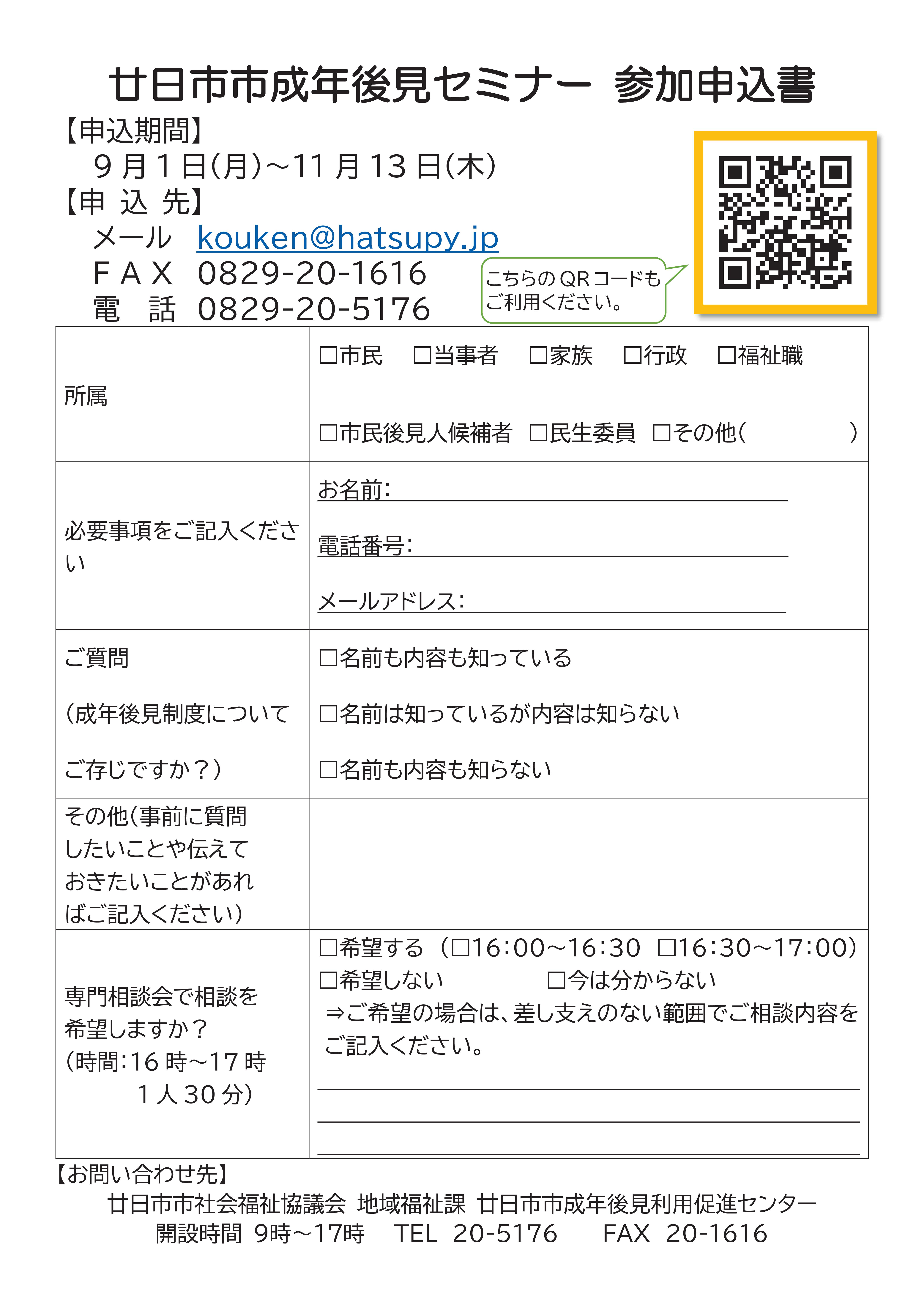 廿日市社会福祉協議会より、11月21日(金)の「令和7年度 成年後見制度市民公開セミナー」開催のご案内について情報提供がありました。